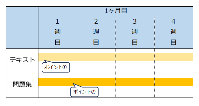 進捗の目安としては、問題集を3回転はしたいので次の表のとおり1日69ページ程度こなしていきましょう。