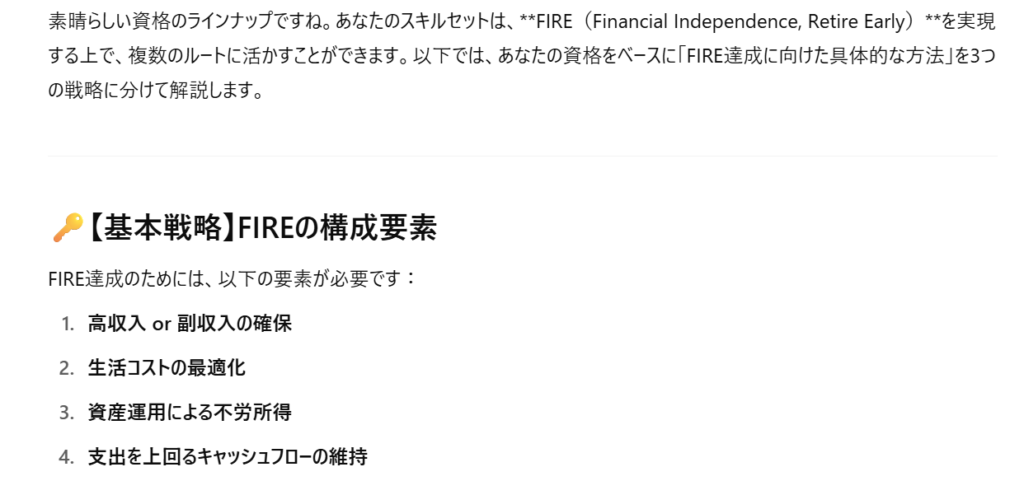 私自身もそう感じていた一人です。そこで今話題のChatGPTに、「自分の保有資格を活かしてFIRE(経済的自立と早期リタイア)を実現する方法はあるのか?」を相談してみました。