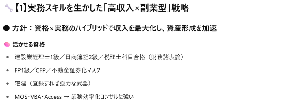 最初に提案されたのは、「保有資格を活かして副業し、投資の元手をつくる」というアイデア。これは非常に現実的で、即行動に移せる内容でした。