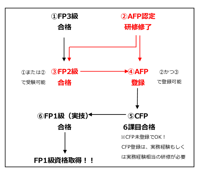 実は、次の図のとおり実務経験がなくても②AFP認定研修修了(③の後でもOK)→③FP2級合格→④AFP登録→⑤CFP6科目合格→⑥FP1級(実技)合格というルートで行けばFP1級資格の取得が可能です。