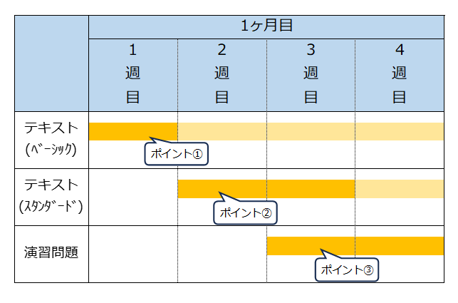 進捗の目安としては、テキストを2回転はしたいので次の表のとおり1日40ページ程度こなしていきましょう。